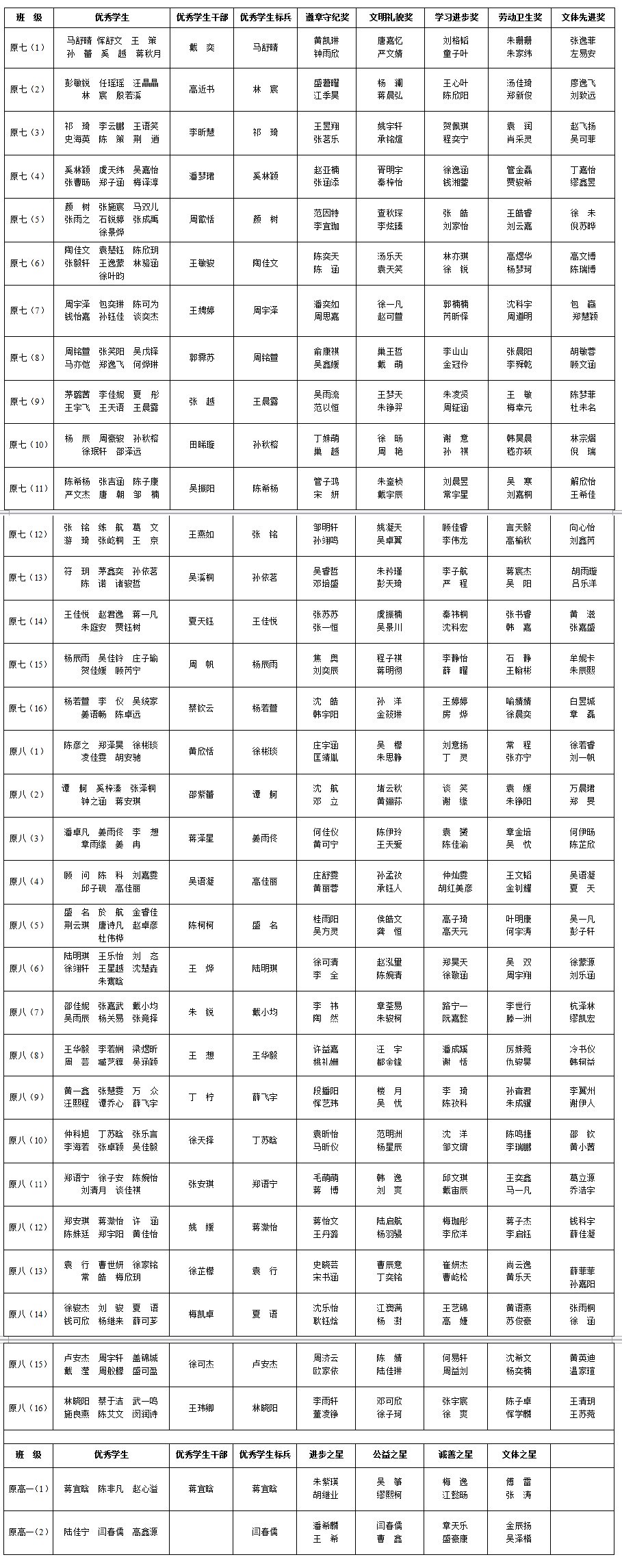 原七年级: 5 班、6 班、9 班、10 班、15 班